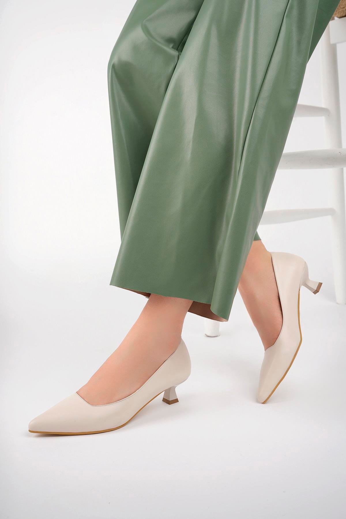 Hakiki Deri Bej Kadın Deri Topuklu Ayakkabı TRC-63817