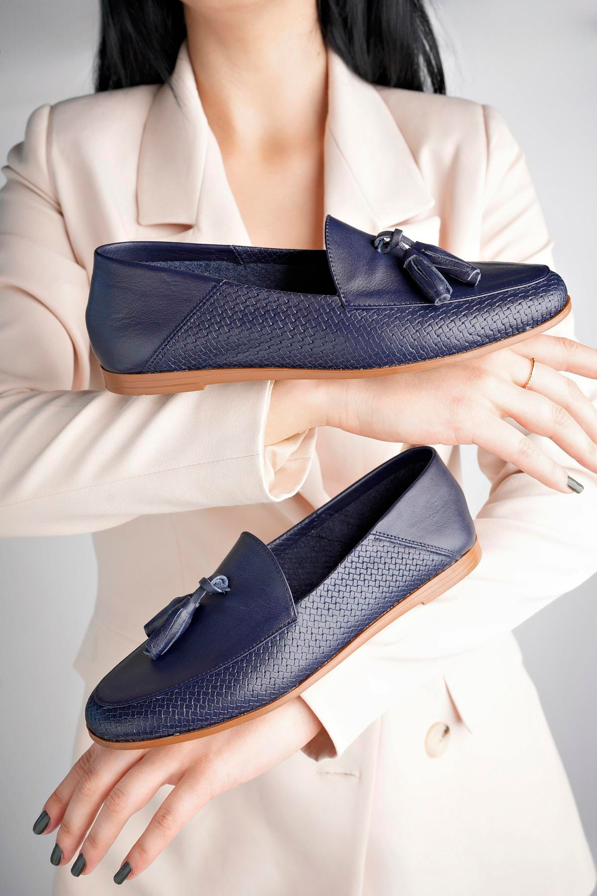 Hakiki Deri Lacivert Baskı 2 Kadın Deri Babet PCC-F04